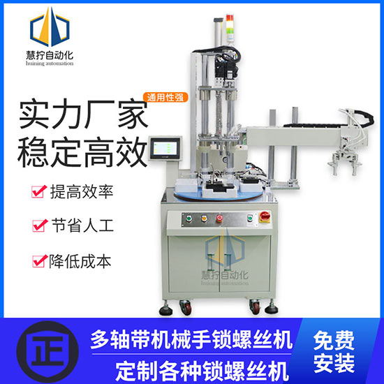 - 多軸式帶機械手全自動鎖螺絲機,在普通的轉盤式自動鎖螺絲機上帶機械手設計,機器一次性擰好產品上的全部螺絲,由機械手臂抓起并放入流水線或裝產品的箱子,人工只需放產品,機器自動打好螺絲,大量節省人工操作。